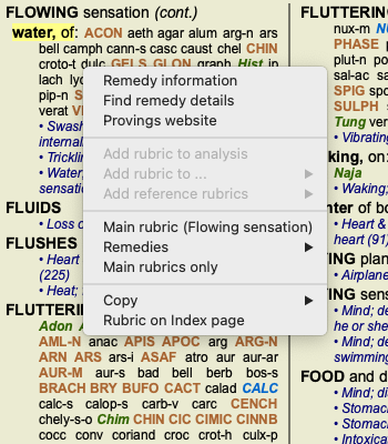 In some situations, double clicking can be used to obtain detailed information about the item clicked on. For example: double clicking on a remedy abbreviation in the book will bring up a dialog with detailed information.