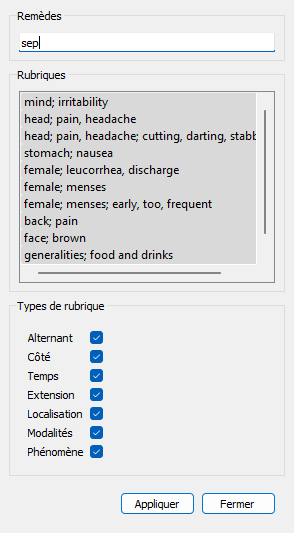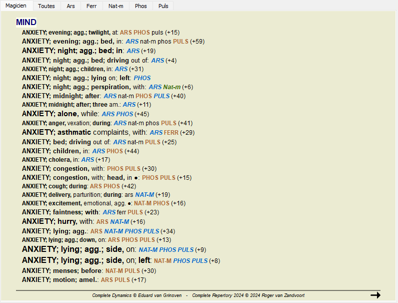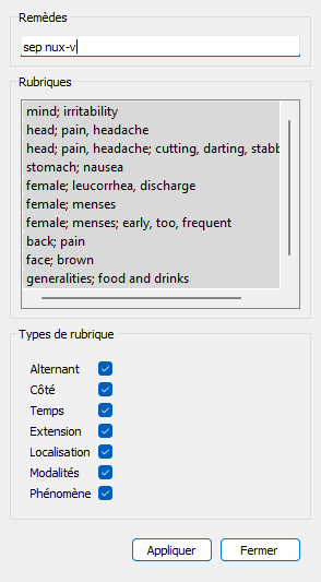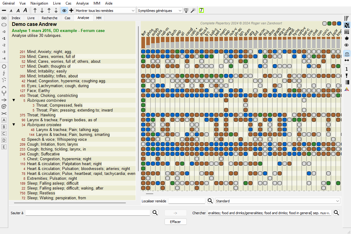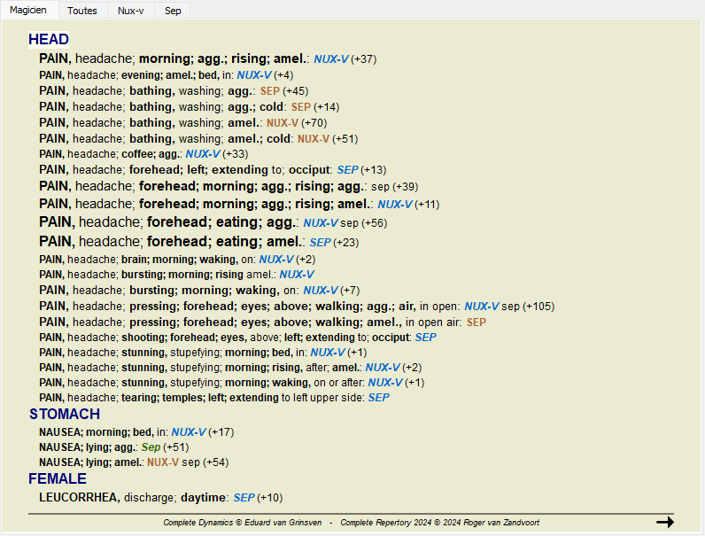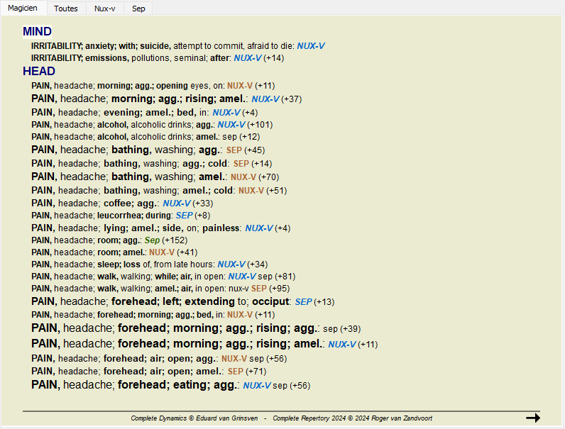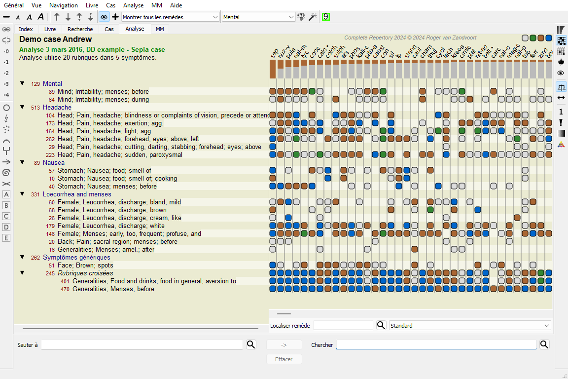Bien que Sepia est le plus élevé dans le résultat de l'analyse, cela ne signifie pas nécessairement qu'il est le remède à prescrire. Dans ce cas, nous avons voulu différencier Sepia et Nux Vomica, parce que ces remèdes sont complémentaires, et les deux sont bien élevés dans l'analyse.