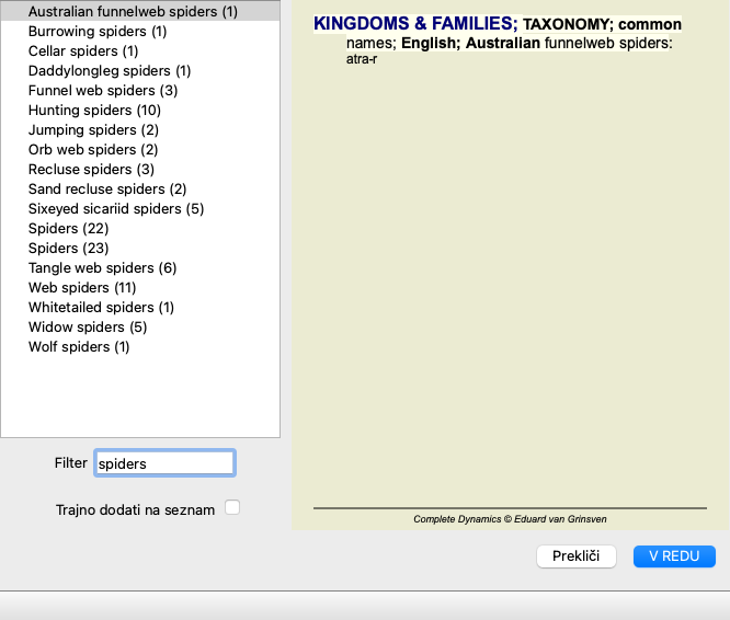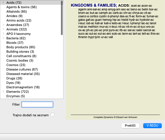 Številne pogosto uporabljene skupine so vnaprej določene (minerali, rastline, živali, nosode). Če želite izbrati drugo skupino, preprosto izberite možnost Other... in prikazalo se bo pogovorno okno, v katerem lahko izberete eno od skupin v razdelku Kingdoms & Families.