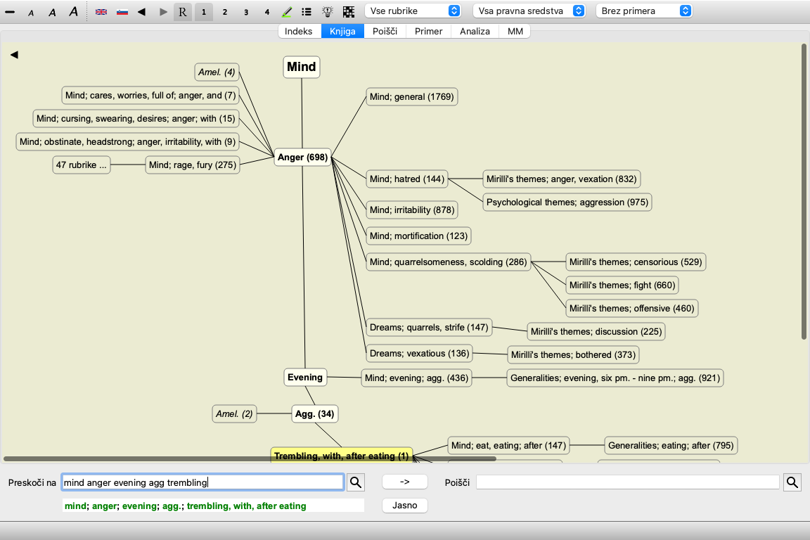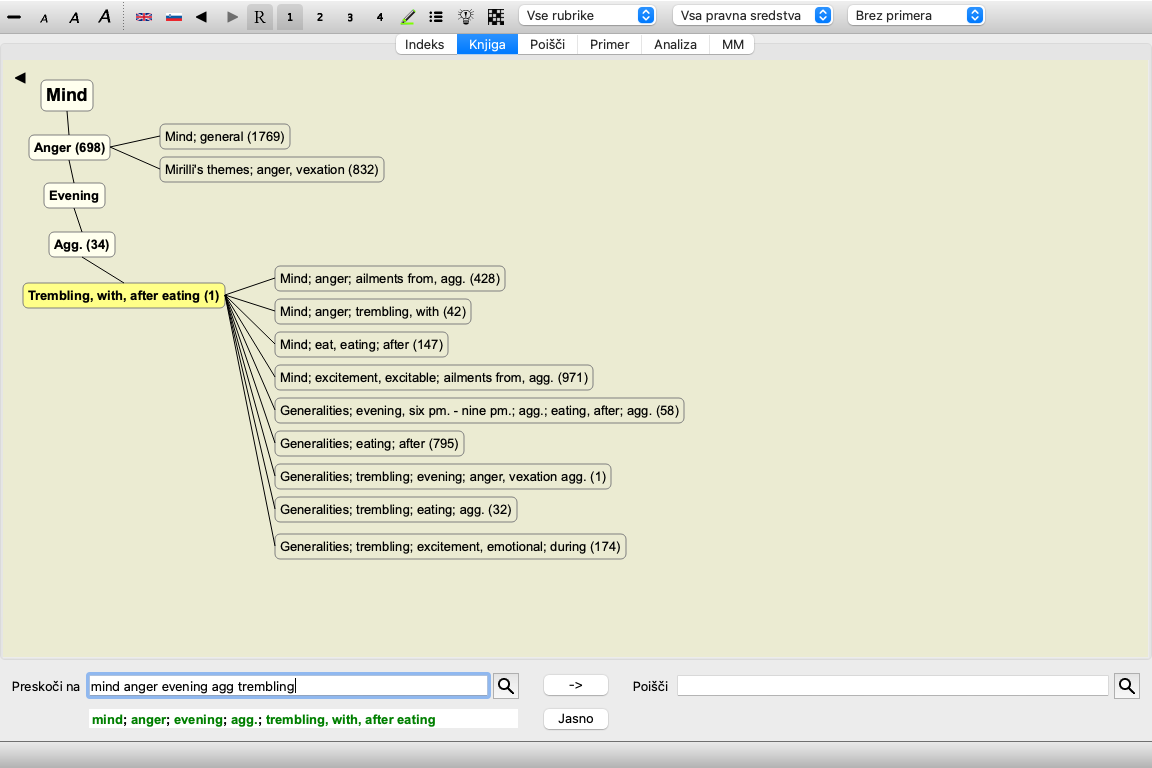 Kot primer si oglejmo rubriko Um; jeza; večerno poslabšanje; tresenje z, po jedi. Ta rubrika je sestavljena iz nekaj osnovnih elementov:
