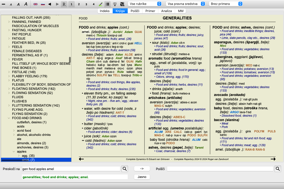 Modul Book prikazuje rubrike repertorija in zdravila kot v tiskani knjigi. Ta postavitev je priročna za branje, vendar ne prikazuje rubrične strukture repertoarja.