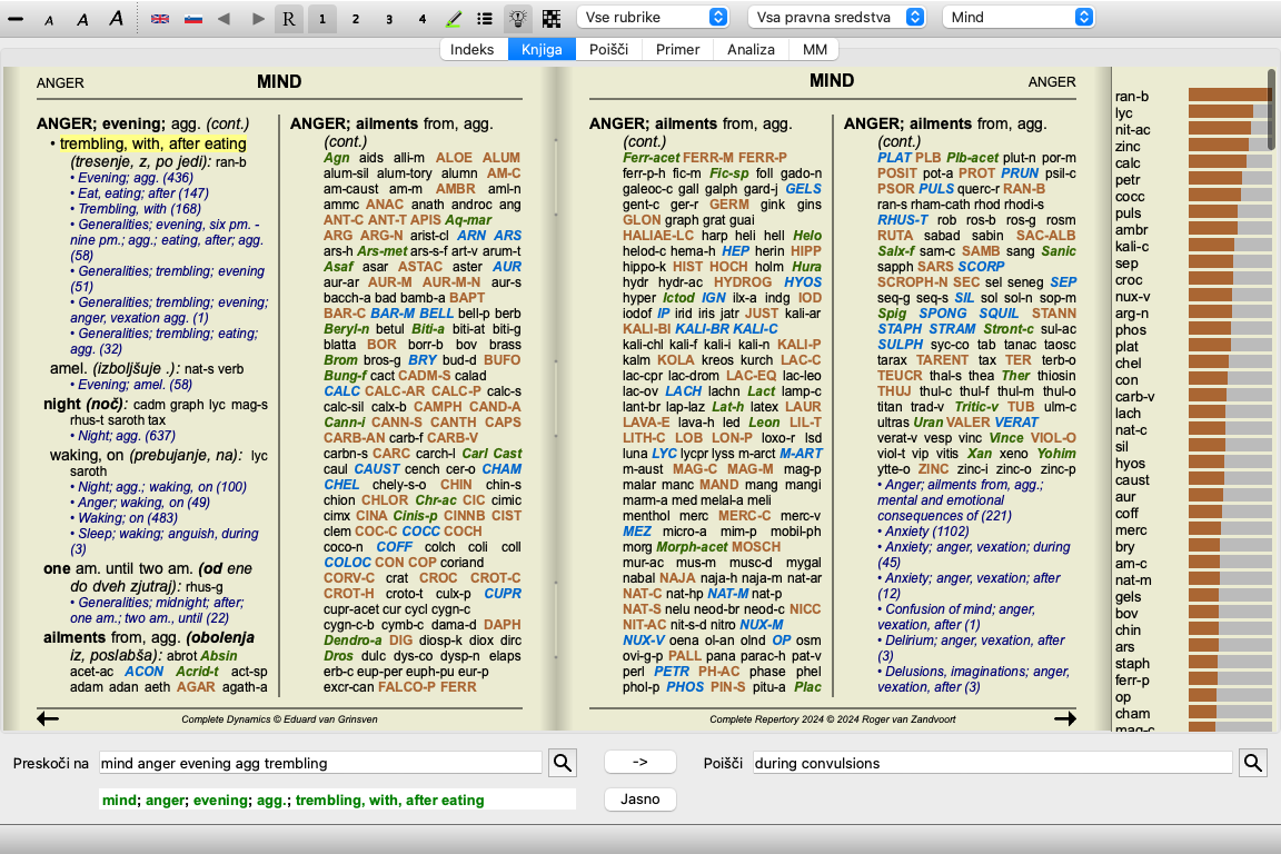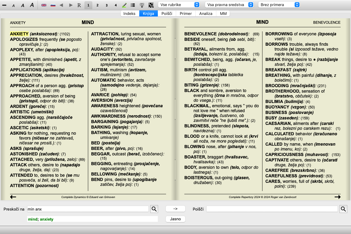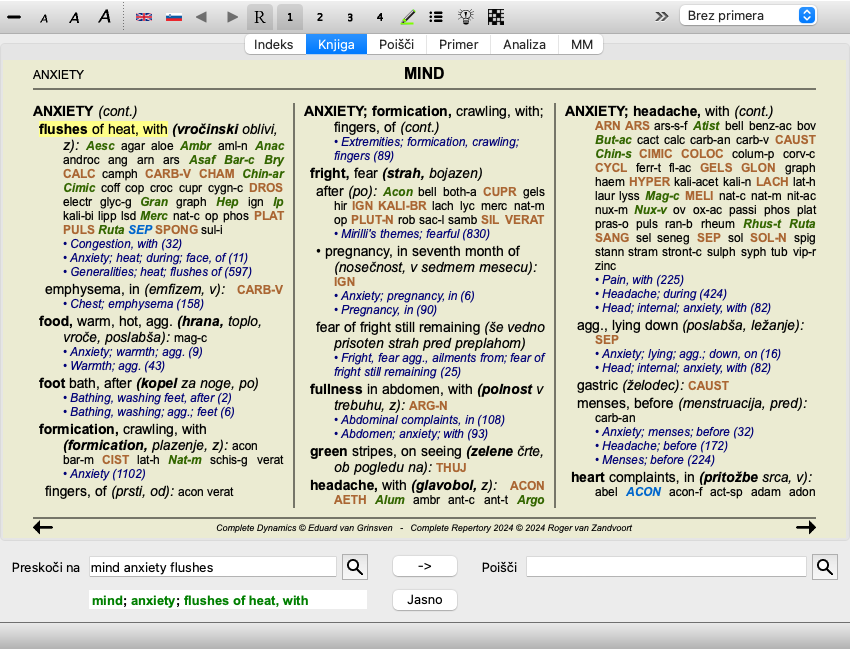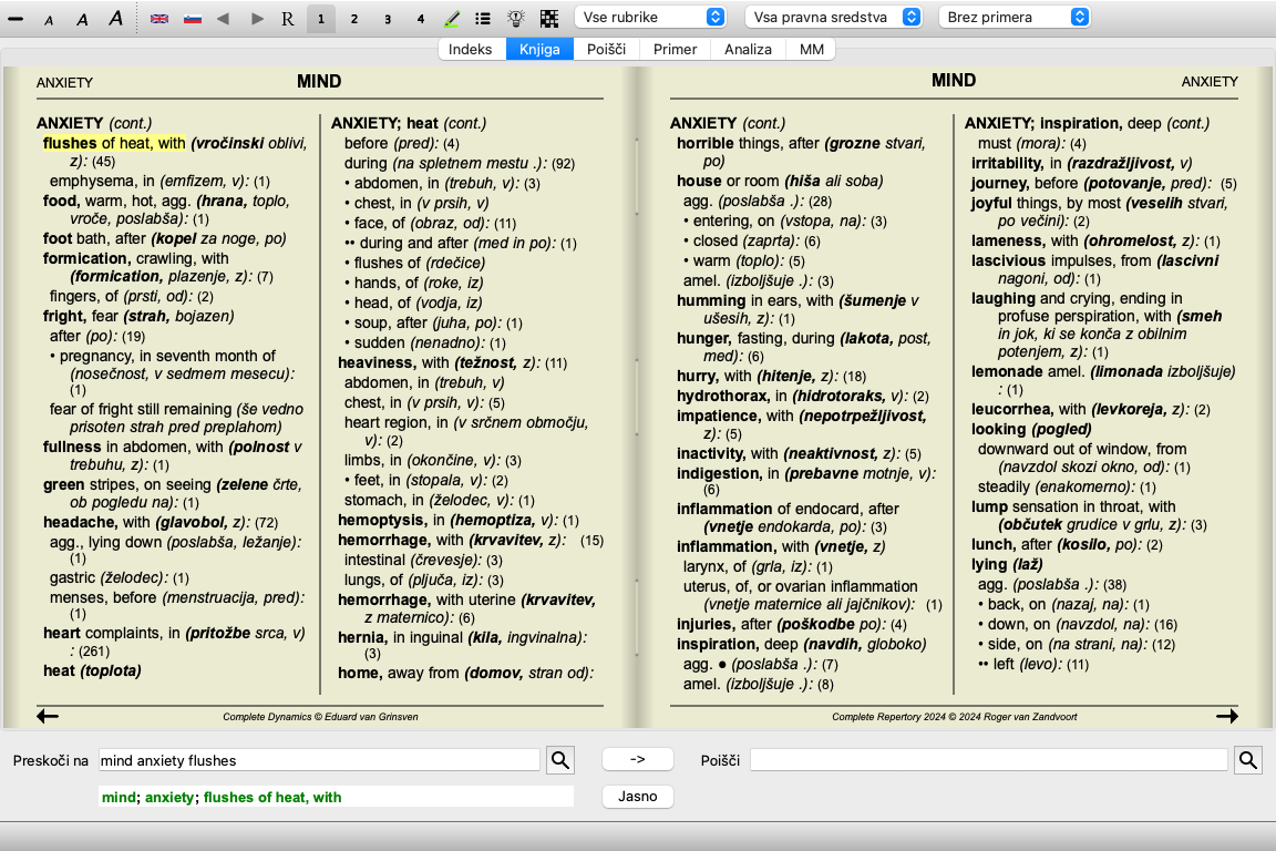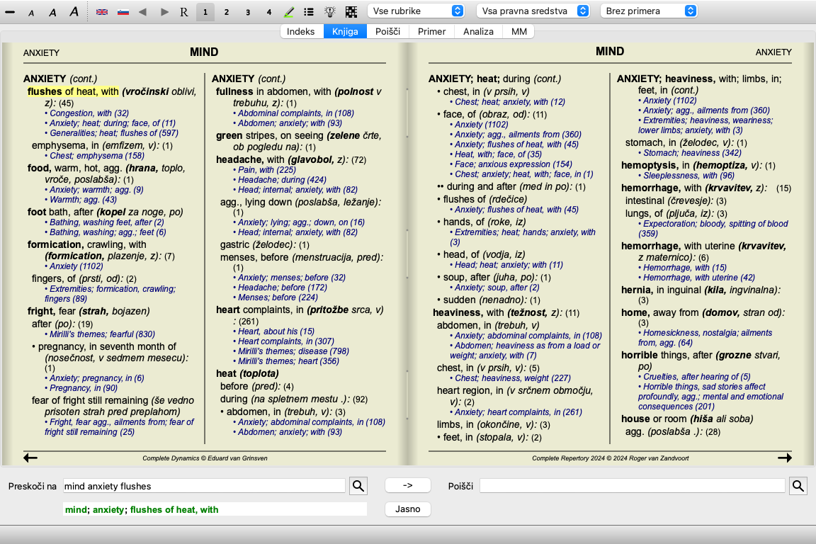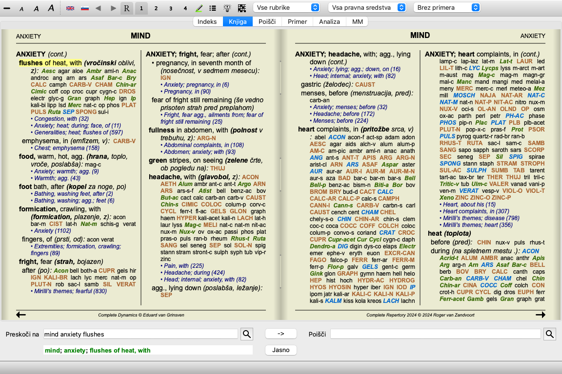 V naslednjem primeru je knjiga odprta pri rubriki Um; tesnoba; vročinski oblivi, s.
