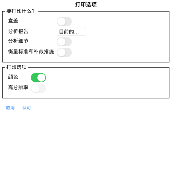| 目前的分析 | 如果你只想打印当前所选的分析,选择这个选项,其设置与分析模块中使用的一样 。 |