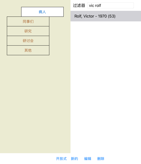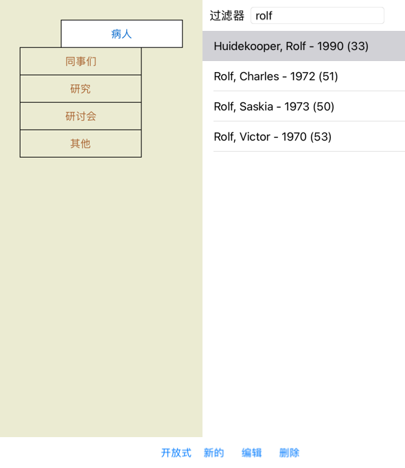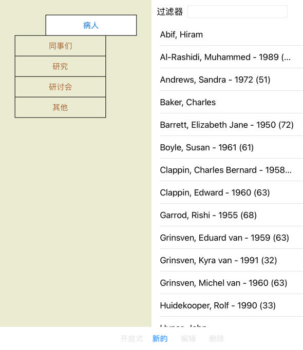 所选组别中的病例显示在一个列表中,只有病人信息的摘要。姓名和出生年份。通过在列表下方的Filter 字段中输入病人姓名的一个或多个部分,可以对病例进行过滤。