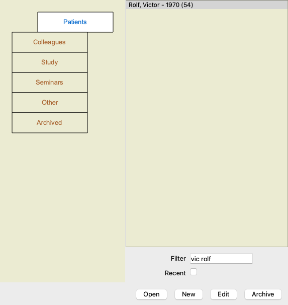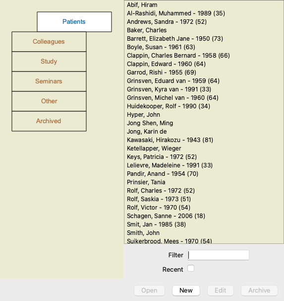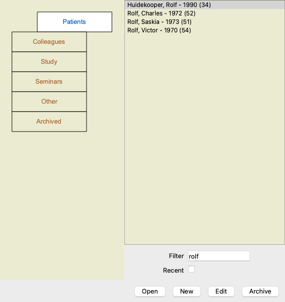 This can, for instance, be practical if you want to create a list for a colleague that monitors your patients. You could then make a list with just the names and birthdates of the patients you have seen in the last 6 months, with a list of remedy prescriptions.