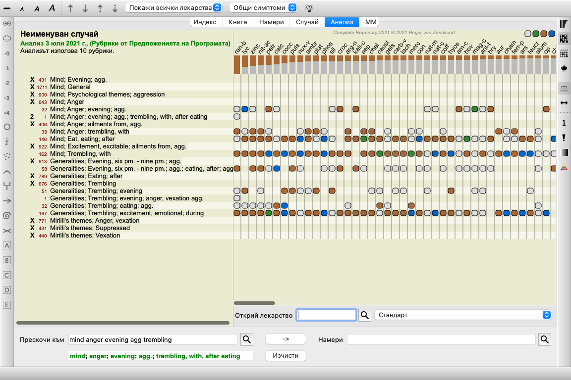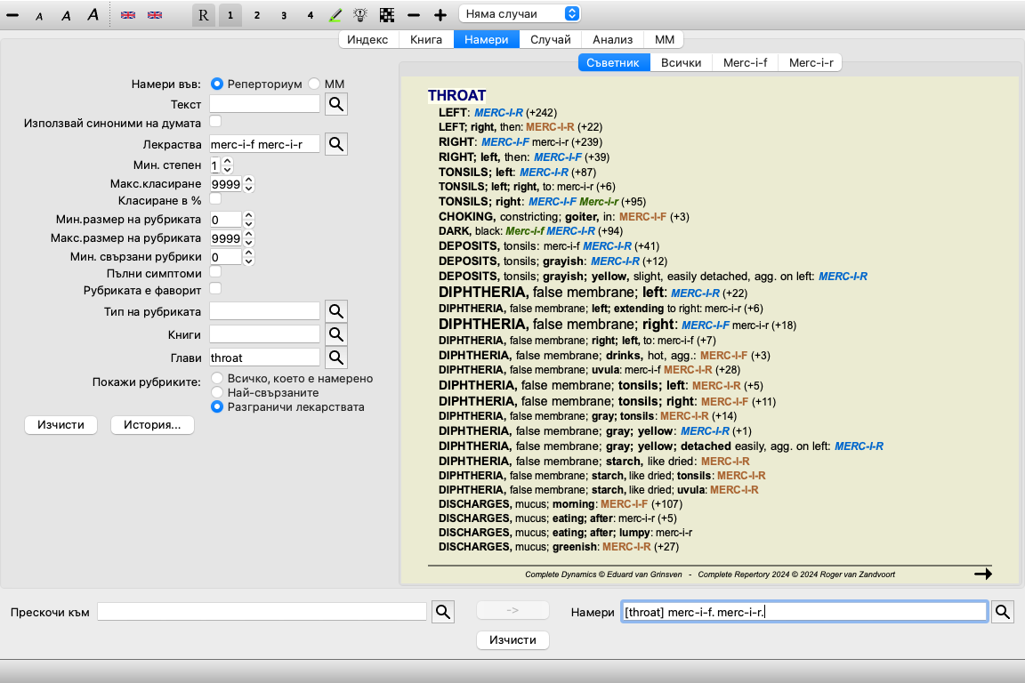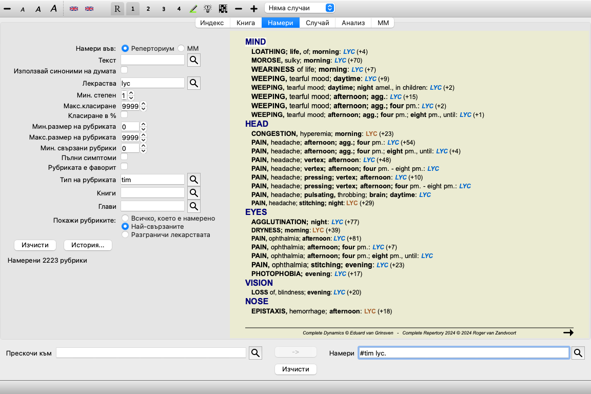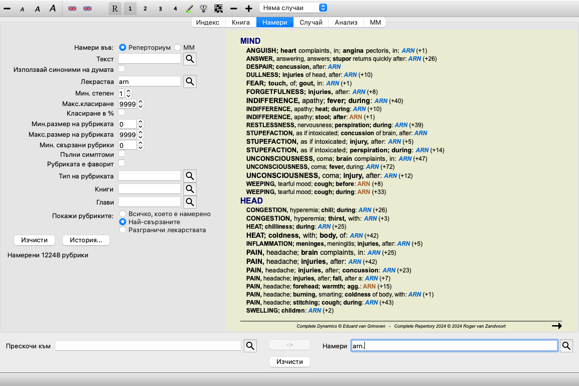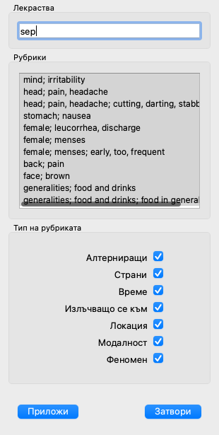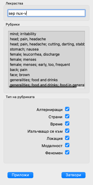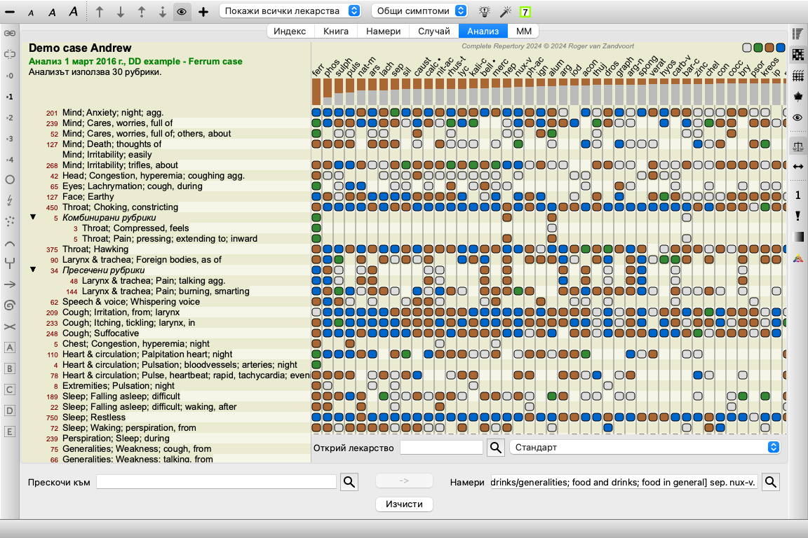Оставяме на Вас да експериментирате с тези опции да избирате специфични симптоми и типове рубрики и да видите как това променя резултатите.
