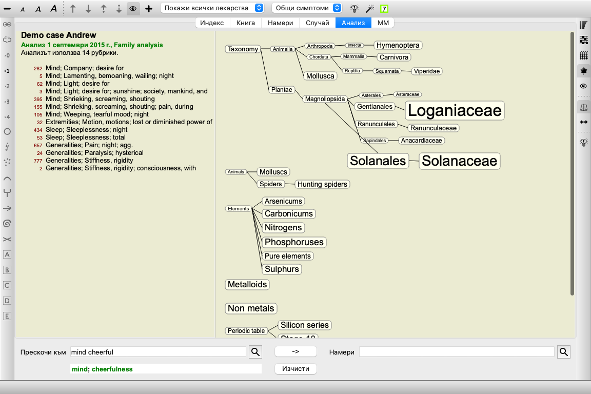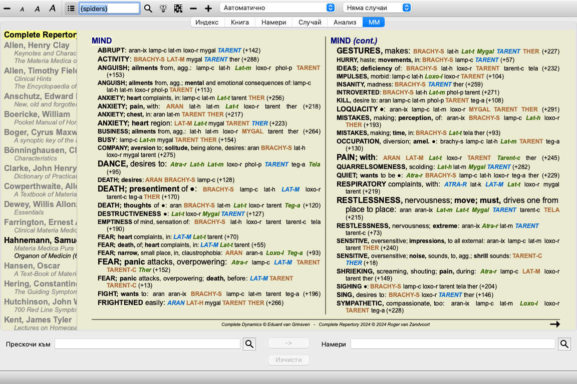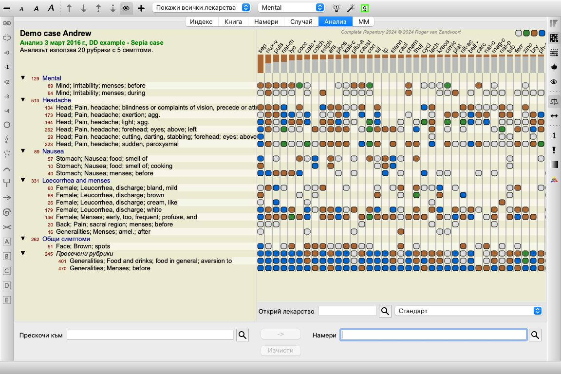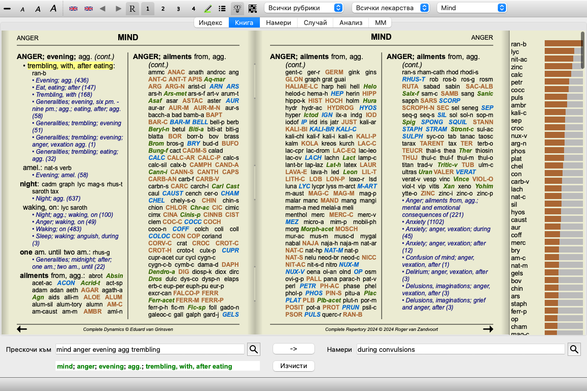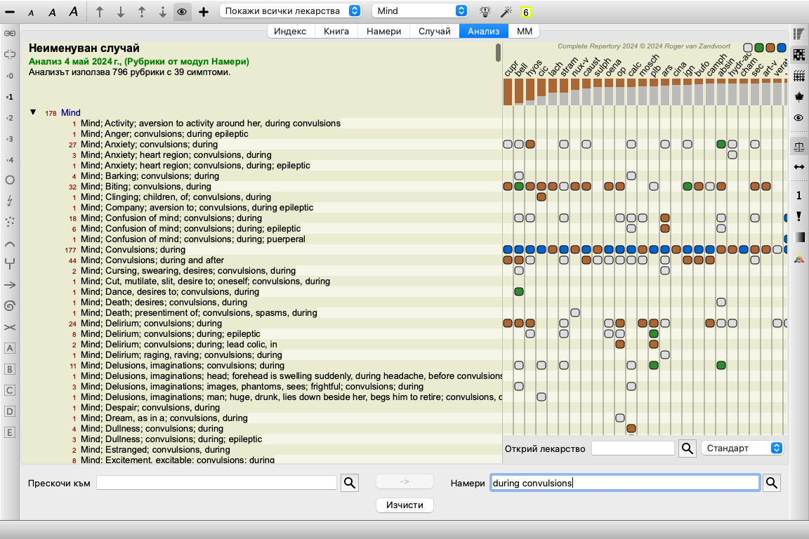 Оставяме на Вас да експериментирате с тези опции да избирате специфични симптоми и типове рубрики и да видите как това променя резултатите.