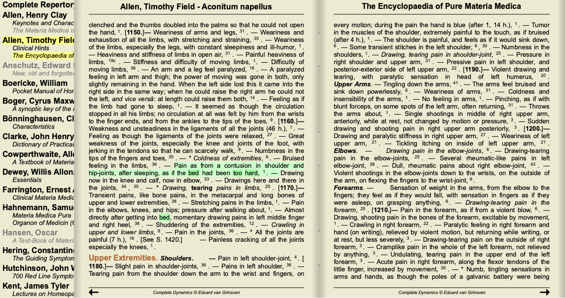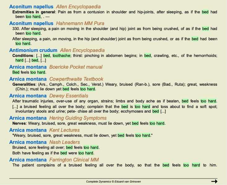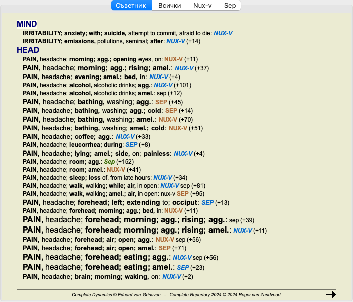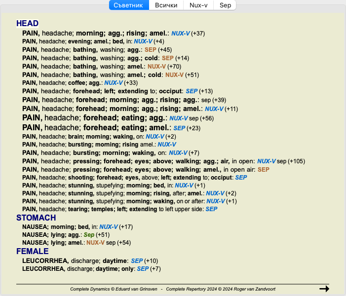 Така например рубриката Head; pain; morning; agg е по-специфична, отколкото Generalities; pain; morning; agg.