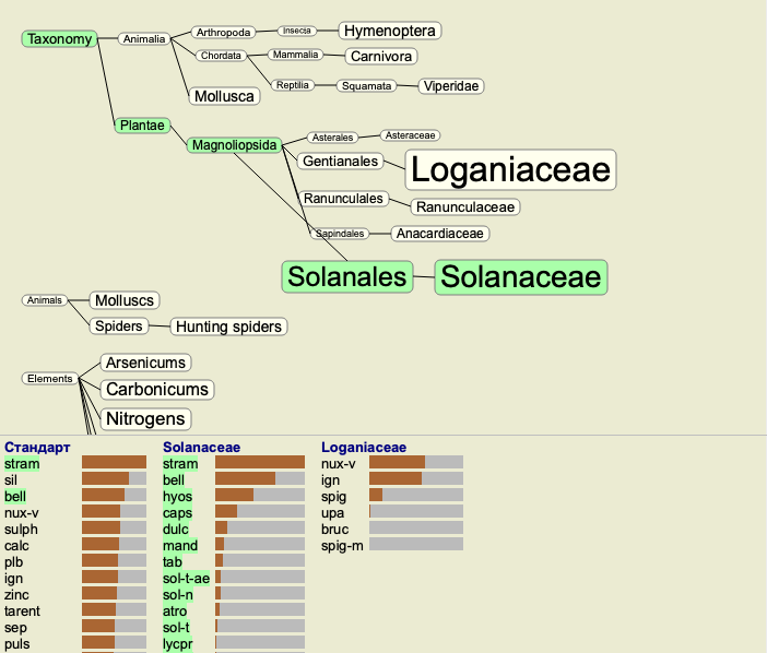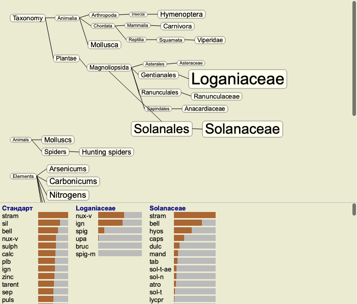 В допълнение към създаването на Реверсивна Материя Медика за всяко отделно лекарство, Вие можете също да търсите най-знаковите рубрики за дадено Царство или Семейство.