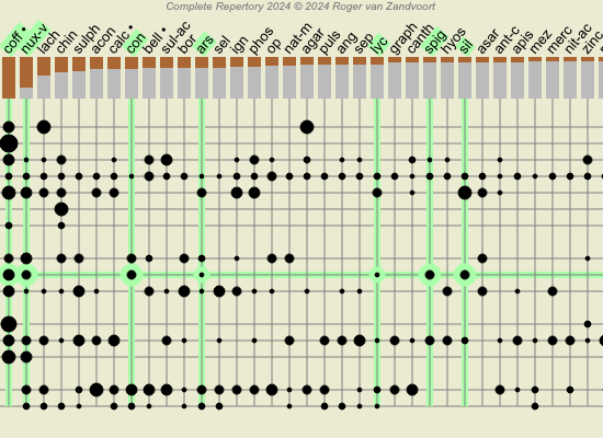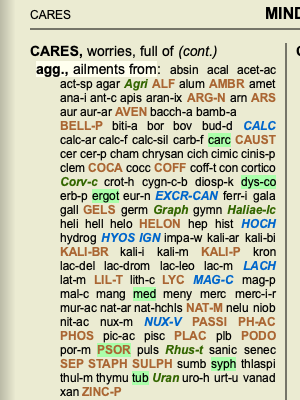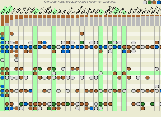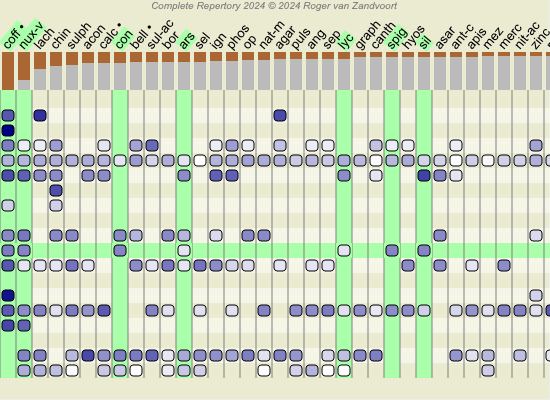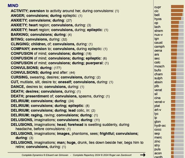 Рубриката съдържа едно единствено лекарство. Най-вероятно лекарството, което търсите ще бъде в една от многото генерични рубрики или може да бъде намерено чрез комбиниране на няколко от многото генерични компоненти на симптома.