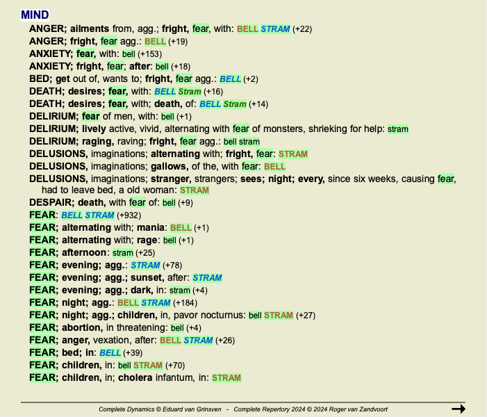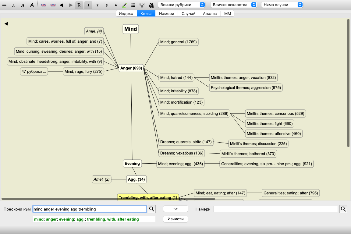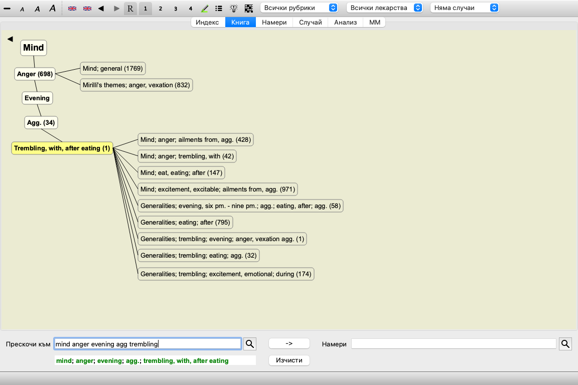 Като пример нека да видим рубрика Mind; Anger; evening agg.; trembling with, after eating. Тази рубрика е изградена от няколко елементарни елемента: