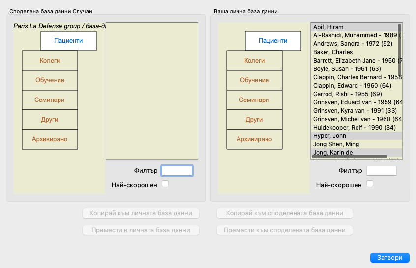 В лявата страна виждате случаи в отворената Споделена База Данни. В дясната страна виждате случаите от Вашата лична База Данни.