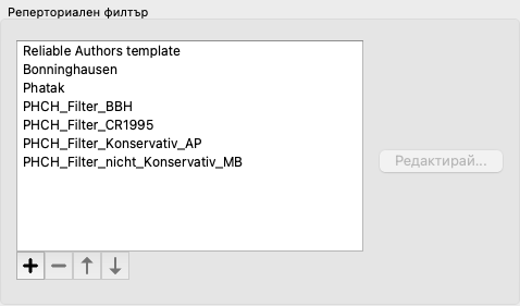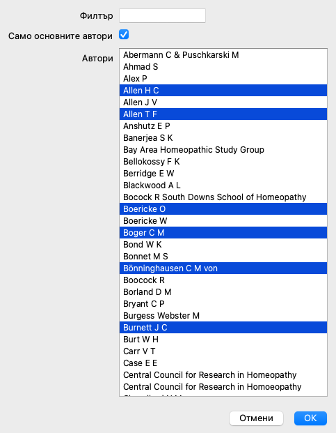 Изберете авторите, които искате да разрешите във Вашия филтър. Най-важните автори са представени в списъка. За да покажете всички автори, използвани в реперториума, отмаркирайте опцията Само основните автори.