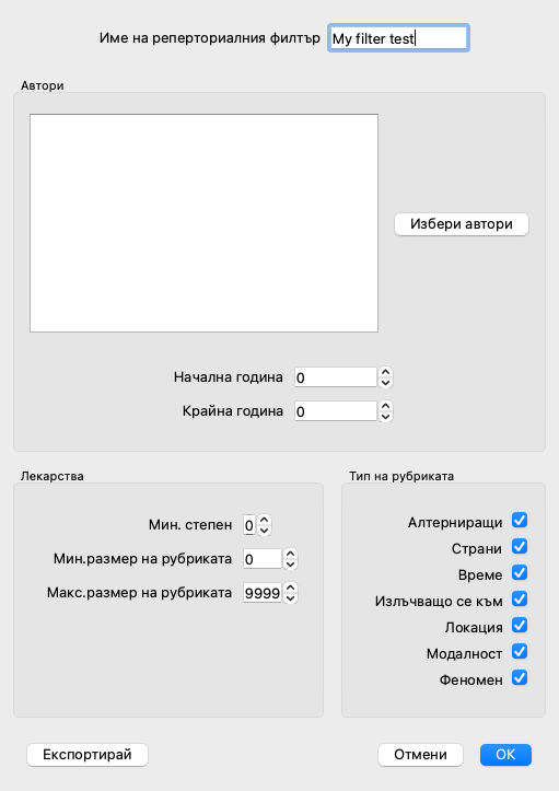 По подразбиране всички автори са във филтъра. За да редактирате списъка с авторите, натиснете бутон Избор на автори.