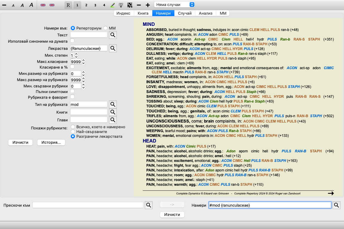 Отбележете, че полето Прескочи към също се настройва да покаже текущо избраната рубрика. Тези комбинирани опции дават максимум свобода и мощ при навигация през реперториума.