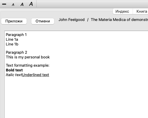 Можете да редактирате или да премахвате Вашите лични бележки. (Опция от менюто Книга / Редактирай / Редактирай бележките за рубриката, Меню с опции за попъп - изскачащи прозорци Редактирай / Редактирай бележките за рубриката). Ще се отвори диалогов прозорец, за който няма да имате нужда от допълнителни обяснения.