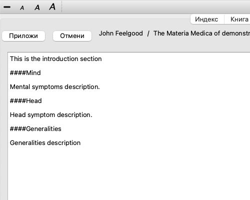 За да организирате Вашата Материя Медика в индивидуални секции, добавете редове като започнете от #### и след тези символи напишете заглавието.