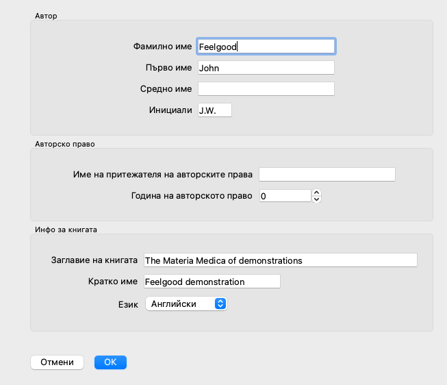 За име на автора попълнете полетата, които желаете, но фамилното име е задължително.