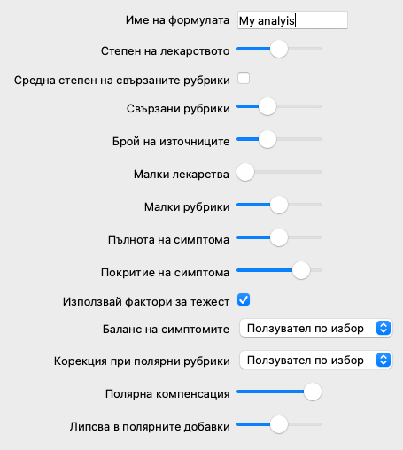 | Покриване на симптомите | Всяко лекарство присъства в определен брой Симптоми и Рубрики. Колкото повече Симптоми и Рубрики са покрити от това лекарство, толкова по-важно може да бъде то за анализа. С тази настройка може да се даде по-голяма важност на лекарства, които покриват по-голям брой от симптомите на пациента. |
