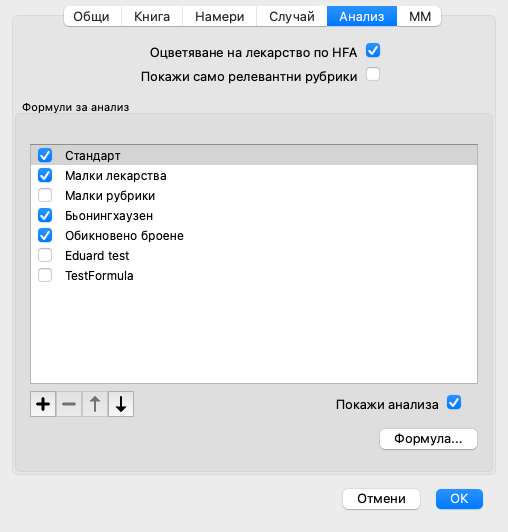 | Използване фактори за тежест | В анализа може да се зададе тежест на Симптомите и Рубриките. Ако тази опция е чекната, то тогава ще бъдат използвани тези тежести при анализната формула. Ако тази опция не е чекната, ще бъдат игнорирани настройките за тежест. |