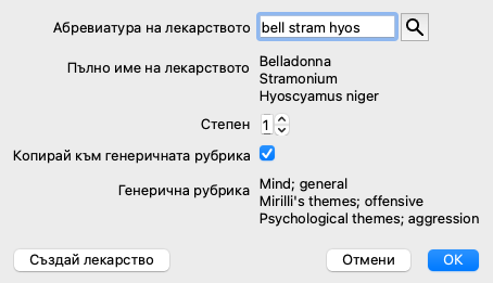 В случай, че желаете да добавите лекарство, което все още не съществува в реперториума, можете да го създадете с бутон Създай лекарство.