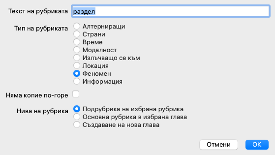 След създаването можете по всяко време да променяте текста и типа на рубриката. (Опция от менюто Книга / Редактирай / Редактирай рубриката, Меню с опции за попъп - изскачащи прозорци Редактирай / Редактирай рубриката).