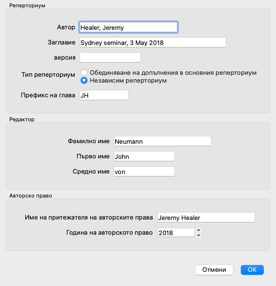Можете да изберете един от авторите. (Опция от менюто Книга / Редактирай / Източник / Избери източник, Меню с опции за попъп - изскачащи прозорци Редактирай / Източник / Избери източник). Ако изберете автор, той автоматично ще стане автор на новите реперториални допълнения.
