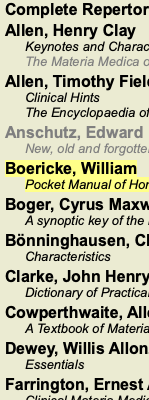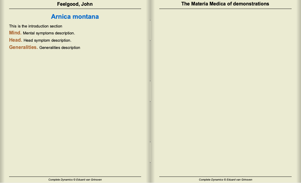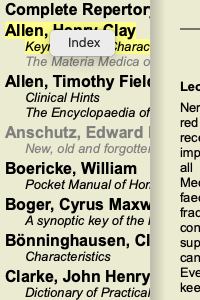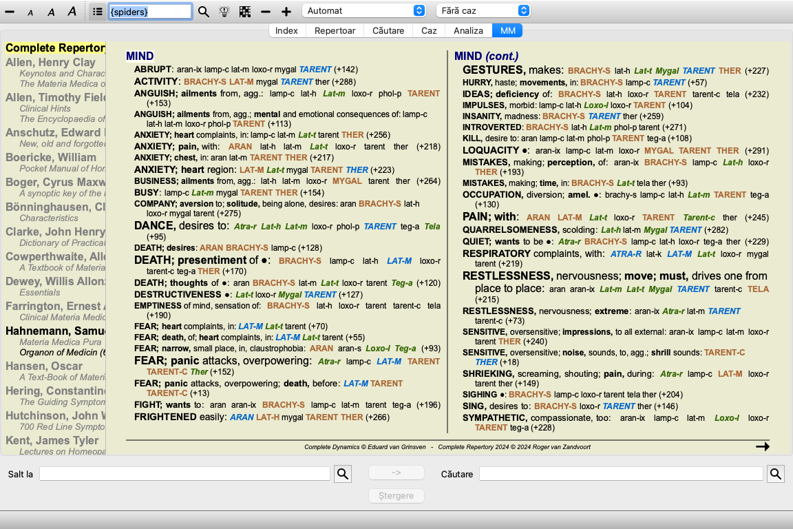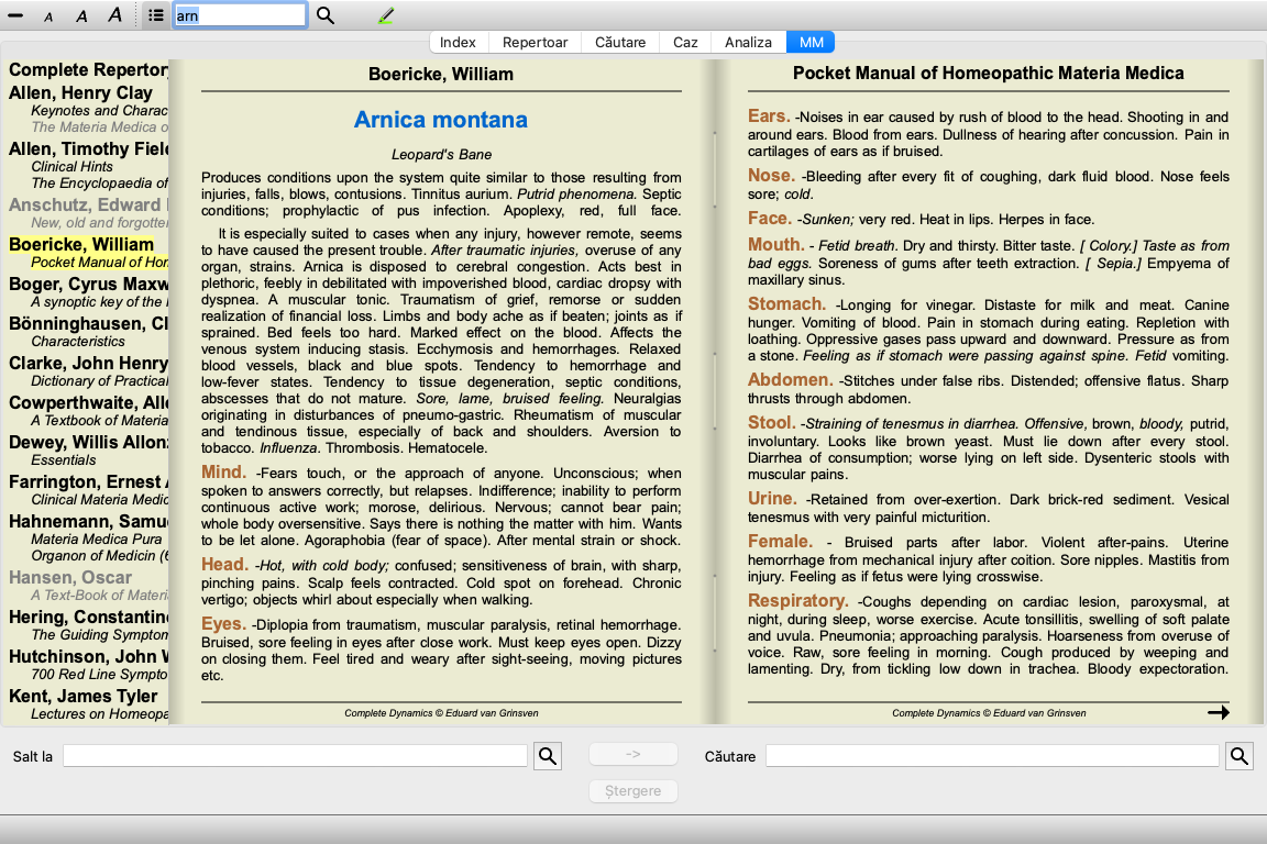 După ce selectați un remediu puteți alege oricare dintre Materia Medica, listate în partea stângă a ecranului. Dacă remediile selectate nu apar in niciuna dintre ele, denumirea cărților apare în gri.