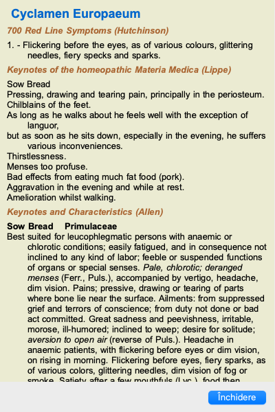 Opțiunea Materia Medica vizualizare rapida prezinta textul mai multor repertoare de Materia Medica în același timp. (Optiunea de meniu Vizualizare / Materia Medica pe scurt, opțiunea de meniu popup Materia Medica pe scurt).