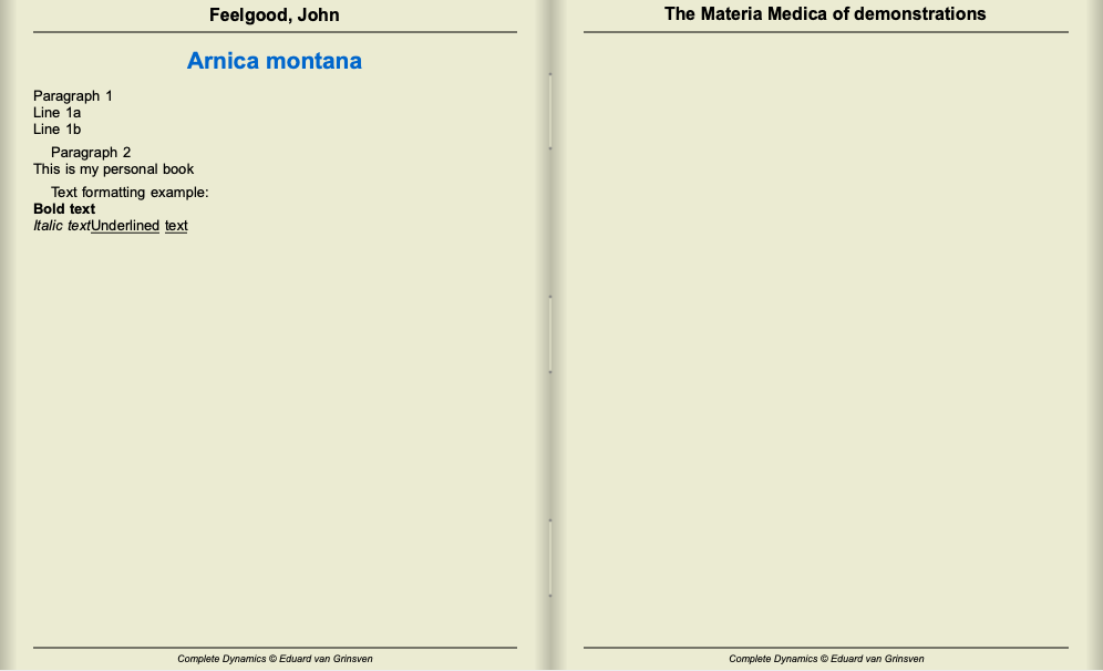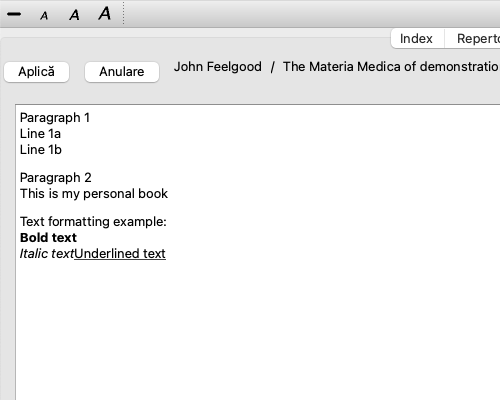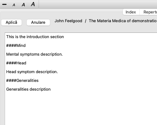Pentru a organiza propria Materia Medica în secțiuni individuale, adăugați linii începând cu ####, urmate de o etichetă.