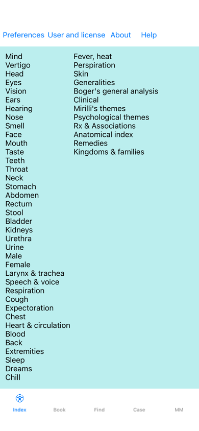 The Find module offers powerful functionality for finding rubrics and remedies in the book. See help section Find module for details.